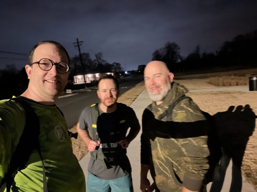 AO: Stargate Q: Enterprise , PAX: Shake and Bake, Chopsticks, Homer, HuggyBear, Enterprise FNGs: None COUNT: 5 CONDITIONS: Balmy 55-60 F with a slight breeze WARMUP: no THE THANG: Rucked MARY: N/A ANNOUNCEMENTS: Half Marathon this Saturday CSAUP Rucking Decal coming in April COT: Prayer for Homer sleep doctor visit and wife’s knee pain. Safety